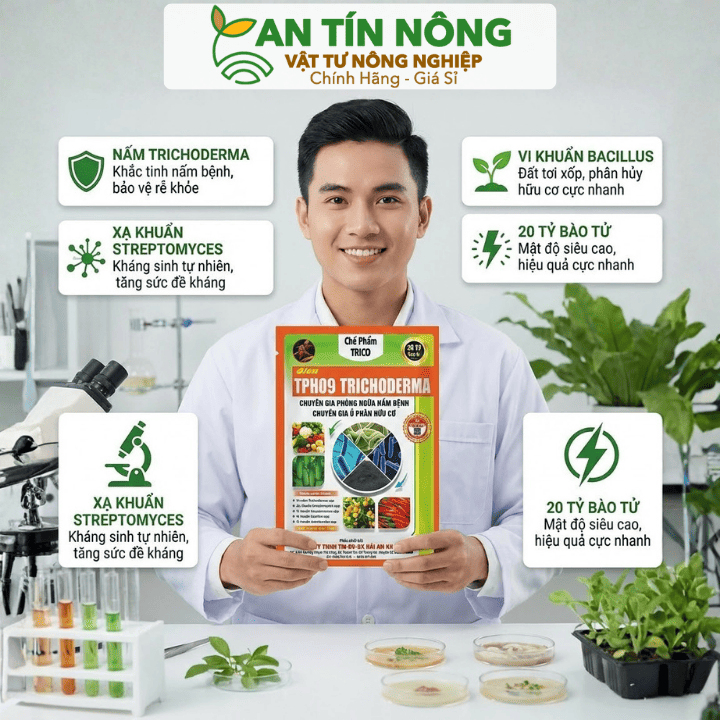 Nấm đối kháng Trichoderma TPH09 giúp diệt nấm đất, trị vàng lá thối rễ và ủ phân hữu cơ cực nhanh. Đặt mua ngay tại An Tín Nông để bảo vệ vườn cây bền vững!