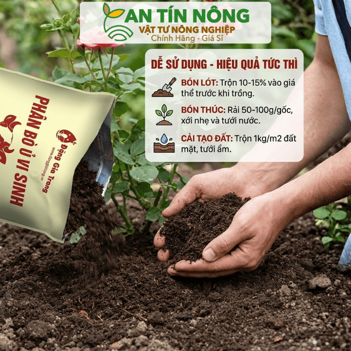 Rau màu, hoa kiểng: Trộn trực tiếp vào giá thể theo tỷ lệ 1:3 (1 phần phân bò : 3 phần đất sạch). Bón thúc định kỳ 15-20 ngày/lần.
