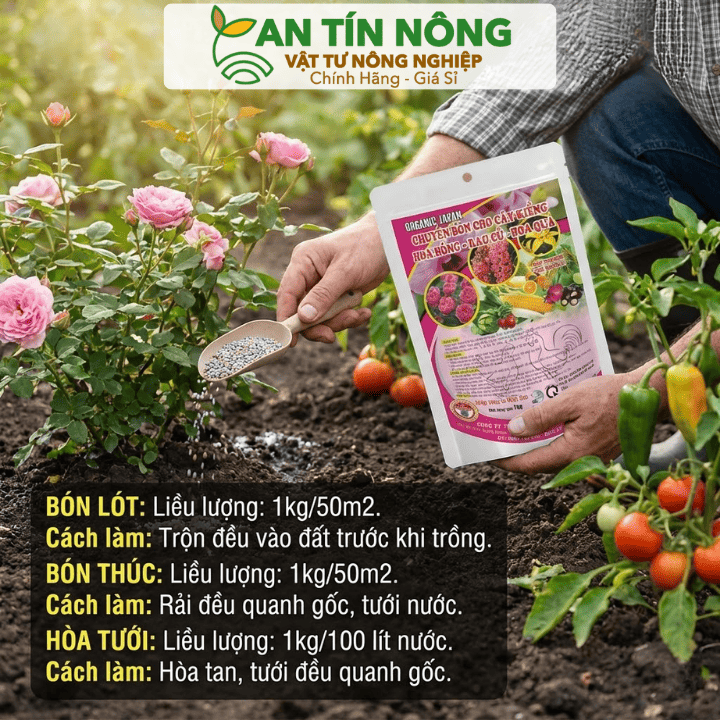 Rau màu (Xà lách, cải, ớt, cà chua): Bón lót trước khi trồng hoặc bón thúc định kỳ. Liều lượng: 0.5kg – 1kg/ $m^2$.